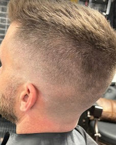 Our standard short cut for hair length at or above mid-ear, using a clipper and/or shears.